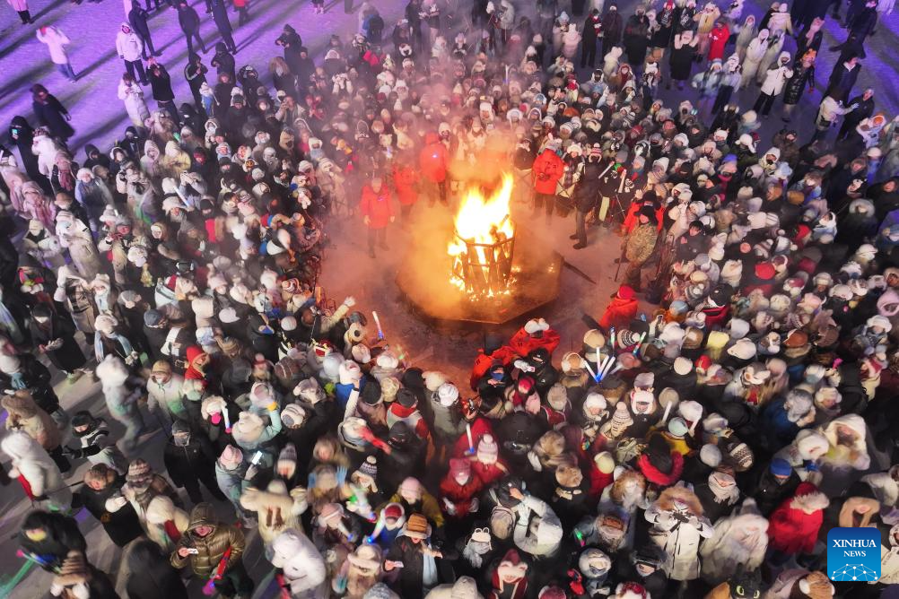 A drone photo shows people gathering around a bonfire during a New Year celebration event in Beiji Village of Mohe City, northeast China's Heilongjiang Province, Dec. 31, 2025.
