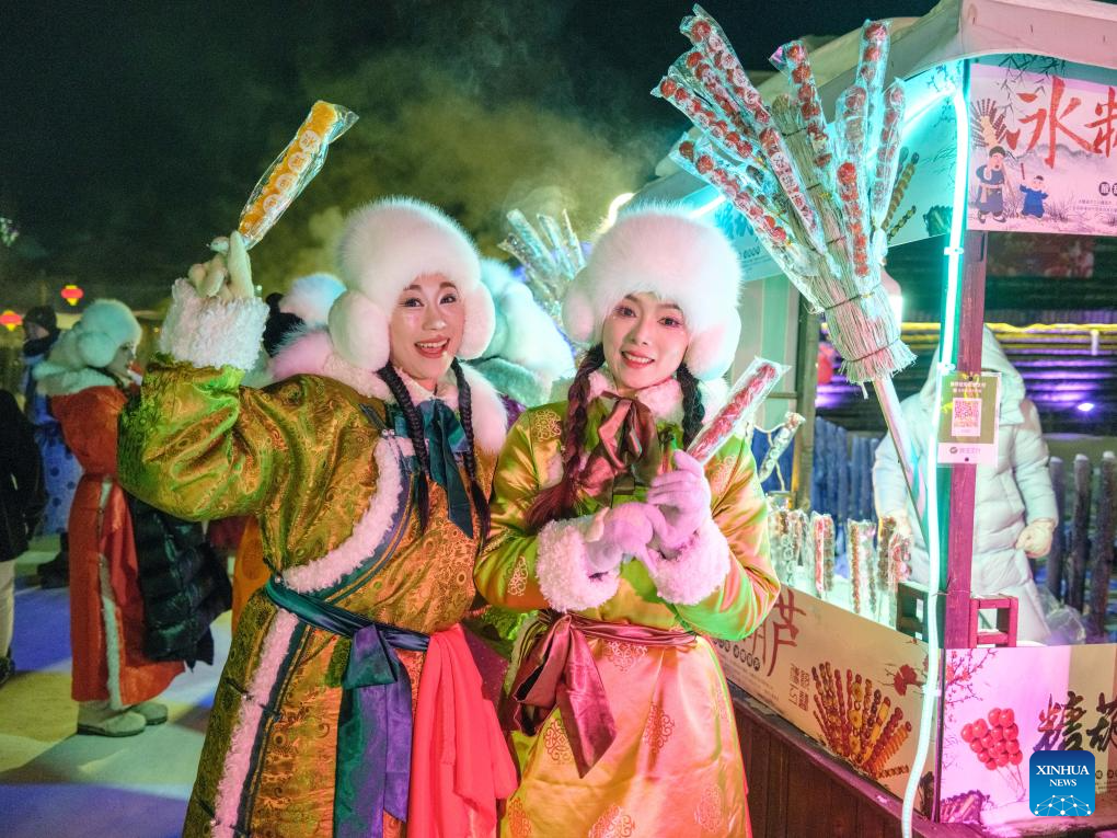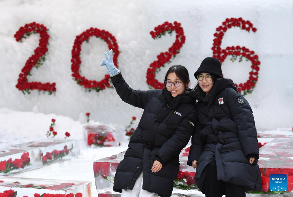 Citizens pose for photos with an ice installation in Shenyang, northeast China's Liaoning Province on Jan. 1, 2026. People across China celebrate the arrival of 2026 with a wide range of festivities on Thursday, the first day of the year. (Xinhua/Li Gang)