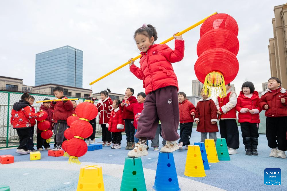 Children participate in a fun sports event at a kindergarten in Changxing County of Huzhou City, east China's Zhejiang Province, on Dec. 31, 2025. Various activities were held across China to celebrate the new year. (Photo by Tan Yunfeng/Xinhua)