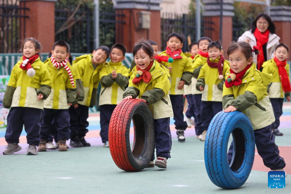 Students participate in a tire-rolling competition at a kindergarten in Wuxing District of Huzhou City, east China's Zhejiang Province, on Dec. 31, 2025. Various activities were held across China to celebrate the new year. (Photo by He Weiwei/Xinhua)pagebreak