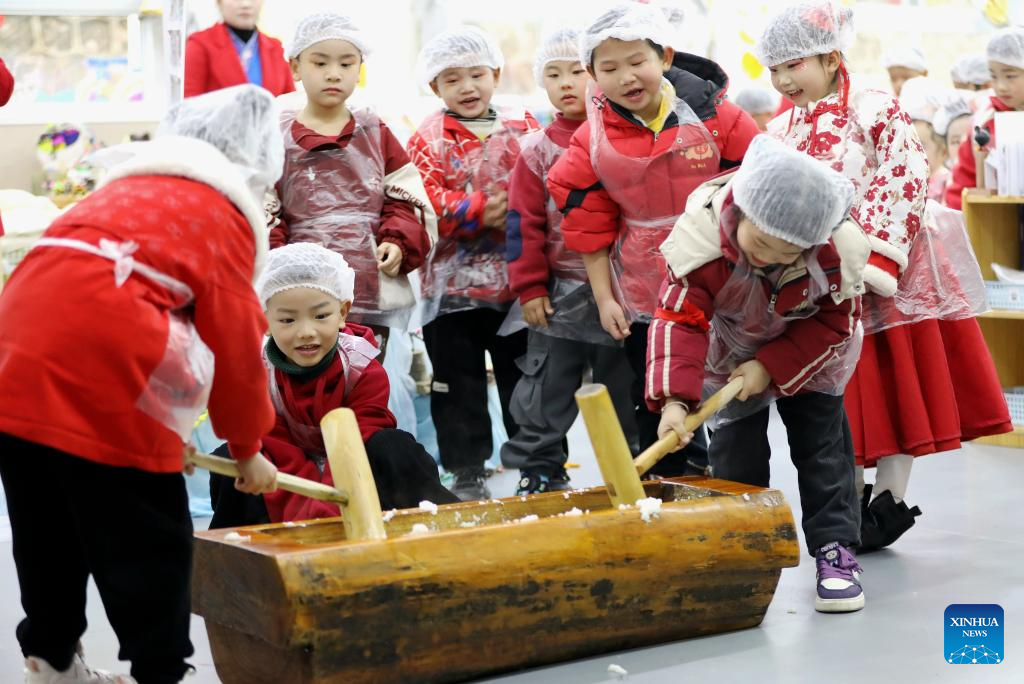 Children make glutinous rice cakes at a kindergarten in Shibing County of Qiandongnan Miao and Dong Autonomous Prefecture, southwest China's Guizhou Province, on Dec. 31, 2025. Various activities were held across China to celebrate the new year. (Photo by Tai Shengzhi/Xinhua)