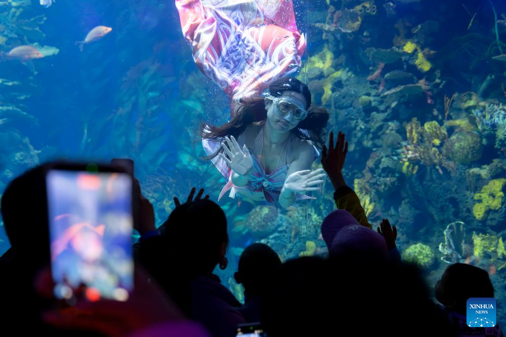 A performer dressed in a mermaid costume greets visitors at an ocean park in east China's Shanghai on Jan. 1, 2026. People across China celebrate the arrival of 2026 with a wide range of festivities on Thursday, the first day of the year. (Xinhua/Wang Xiang)