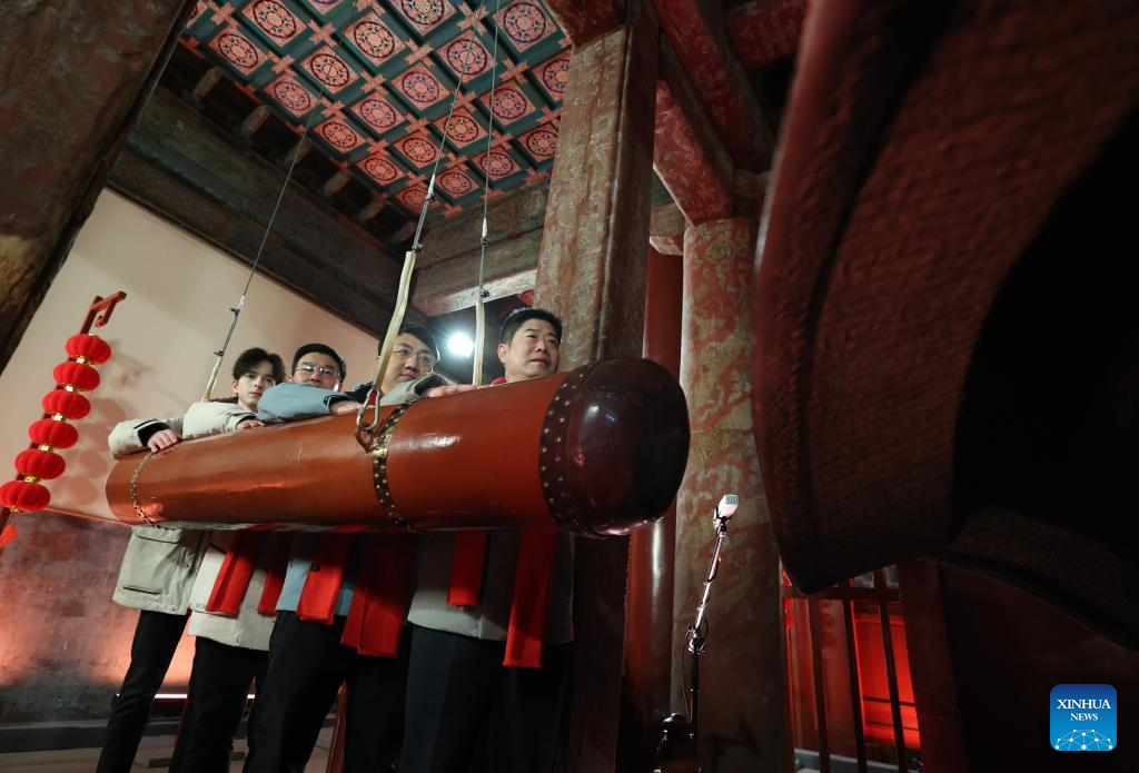 People strike the bell to greet the New Year at the Big Bell Temple (Dazhongsi) Ancient Bell Museum in Beijing, capital of China, Jan. 1, 2026.