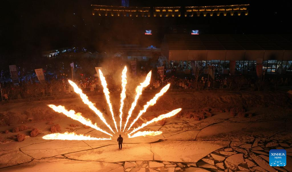 A drone photo shows people watching a performance during a New Year celebration event at Lanshan Park in Yinchuan, northwest China's Ningxia Hui Autonomous Region, Dec. 31, 2025.