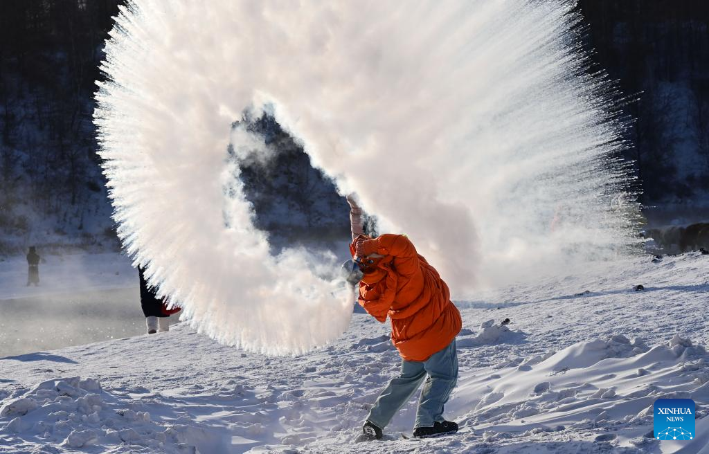 A tourist plays a "water to ice" game by splashing water into the cold air by the Halha River in the city of Arxan of Hinggan League, north China's Inner Mongolia Autonomous Region, Jan. 1, 2026. Despite Arxan's frigid winter cold, this geothermally-affected section of the Halha River never freezes, which attracts great amount of tourists in winter. (Photo by Wang Zheng/Xinhua)