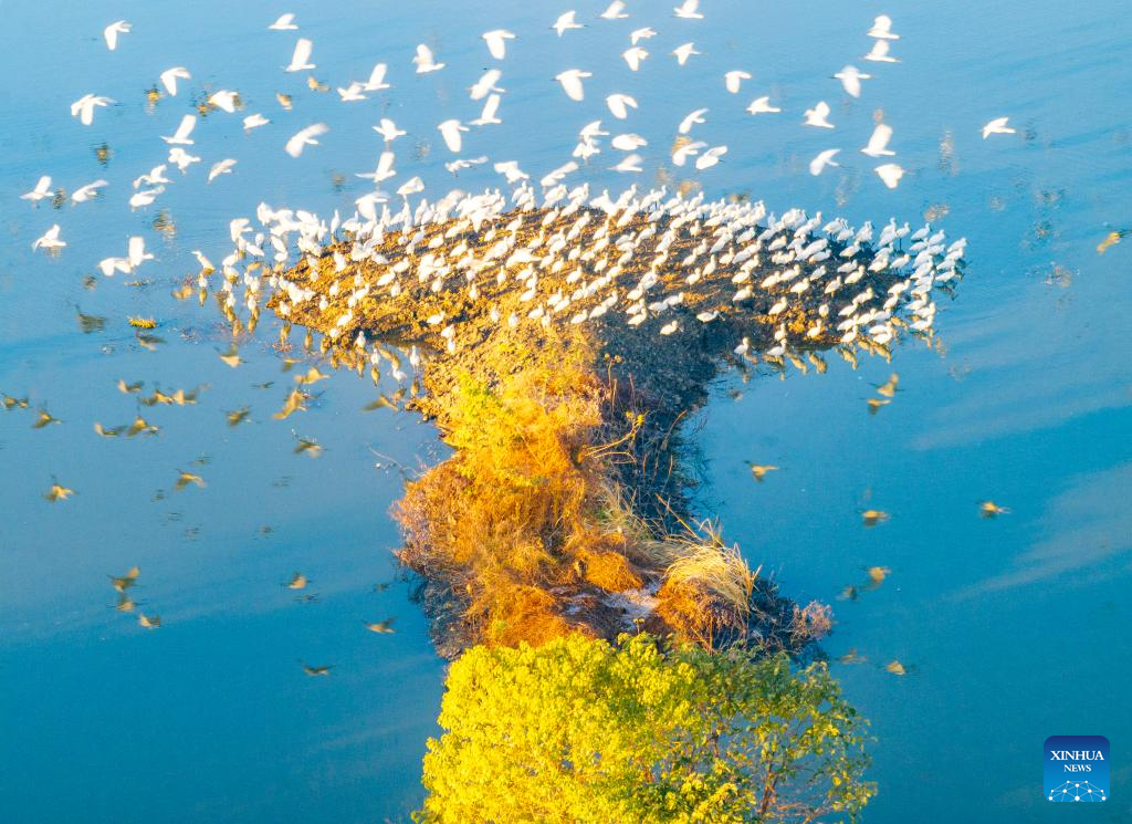 A drone photo shows egrets foraging at a reservoir in the Kazak Autonomous County of Aksay in northwest China's Gansu Province, Nov. 9, 2025. (Photo by Gao Hongshan/Xinhua)
