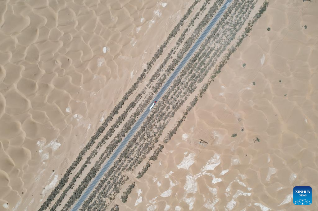 An aerial drone photo taken on July 18, 2025 shows a section of the Tarim Desert Highway and the shelterbelt planted along it in northwest China's Xinjiang Uygur Autonomous Region. The 522-km highway runs across the Taklimakan Desert, the world's second-largest shifting sand desert. (Xinhua/Meng Tao)