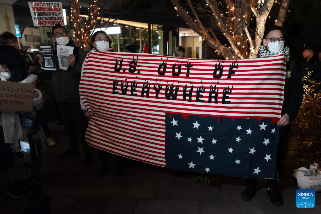 People hold a slogan in support of Venezuela during a protest in front of the U.S. embassy in Tokyo, Japan, Jan. 6, 2026. The U.S. military struck Venezuela on Saturday, capturing President Maduro and his wife and transferring them to the United States. (Xinhua/Jia Haocheng)