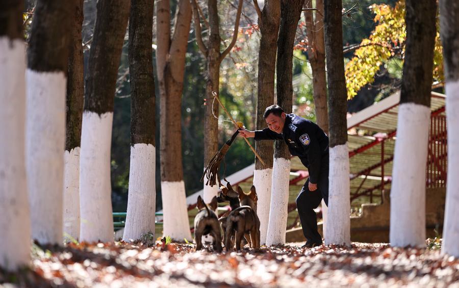 A police dog trainer trains a Kunming dog in explosive detection at the Ministry of Public Security's Kunming police dog base in Kunming, southwest China's Yunnan Province, Dec. 29, 2025. (Xinhua/Gao Yongwei)Kunming dog pups have fun at the Ministry of Public Security's Kunming police dog base in Kunming, southwest China's Yunnan Province, Jan. 5, 2026. (Xinhua/Gao Yongwei)A police dog trainer trains a Malinois dog at the Ministry of Public Security's Kunming police dog base in Kunming, southwest China's Yunnan Province, Jan. 5, 2026. (Xinhua/Jiang Wenyao)Police dog trainers weigh a Kunming dog at the Ministry of Public Security's Kunming police dog base in Kunming, southwest China's Yunnan Province, Jan. 5, 2026. (Xinhua/Gao Yongwei)