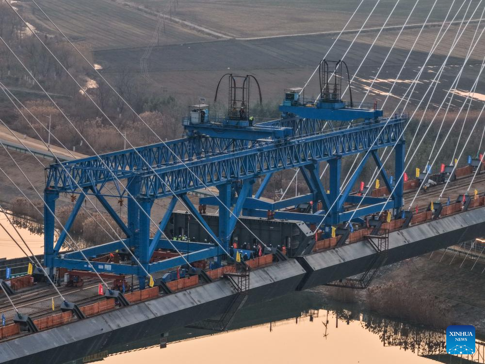 An aerial drone photo taken on Jan. 9, 2026 shows the construction site of the cable-stayed bridge across the Chuhe River in Nanjing, east China's Jiangsu Province. As part of a high-speed railway linking Shanghai, Nanjing of Jiangsu Province and Hefei of Anhui Province, the cable-stayed bridge across the Chuhe River completed its closure on Thursday. (Xinhua)