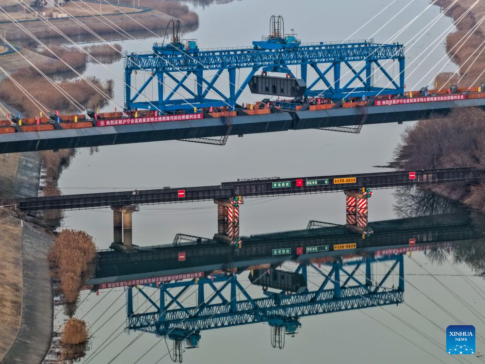 An aerial drone photo taken on Jan. 8, 2026 shows the construction site of the cable-stayed bridge across the Chuhe River in Nanjing, east China's Jiangsu Province. As part of a high-speed railway linking Shanghai, Nanjing of Jiangsu Province and Hefei of Anhui Province, the cable-stayed bridge across the Chuhe River completed its closure on Thursday. (Xinhua/Li Bo)