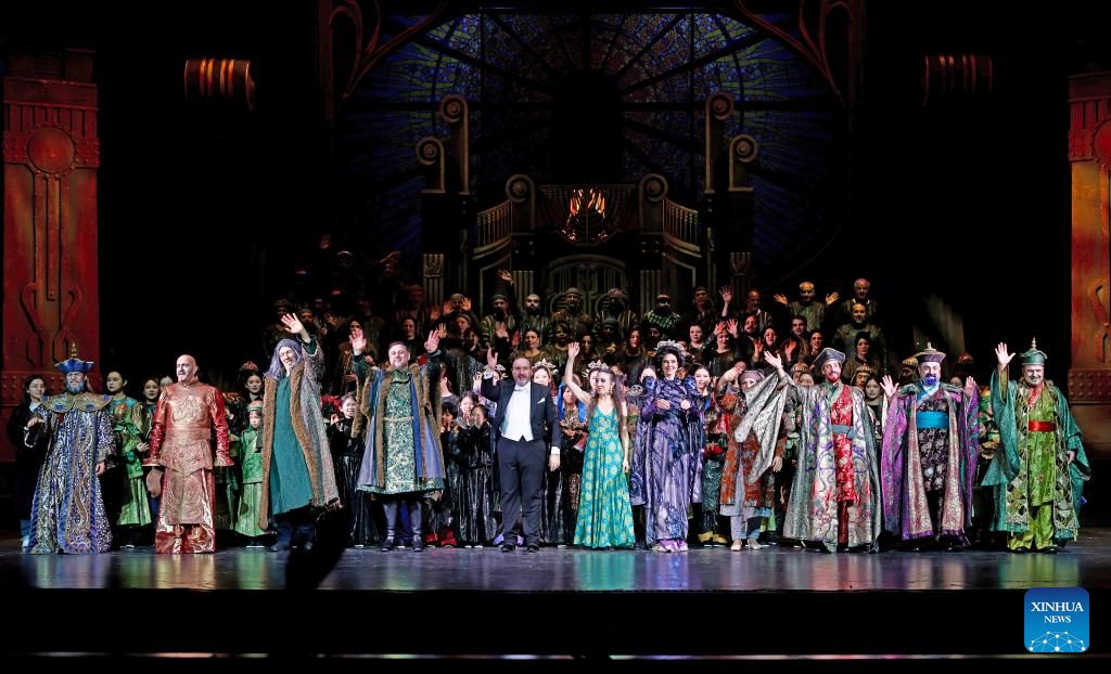 The cast and crew of the opera Turandot acknowledges the audience after the performance at the Chongqing Grand Theatre in southwest China's Chongqing, Jan. 10, 2026. (Xinhua)