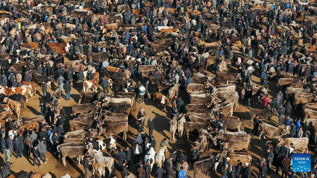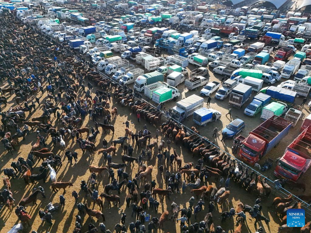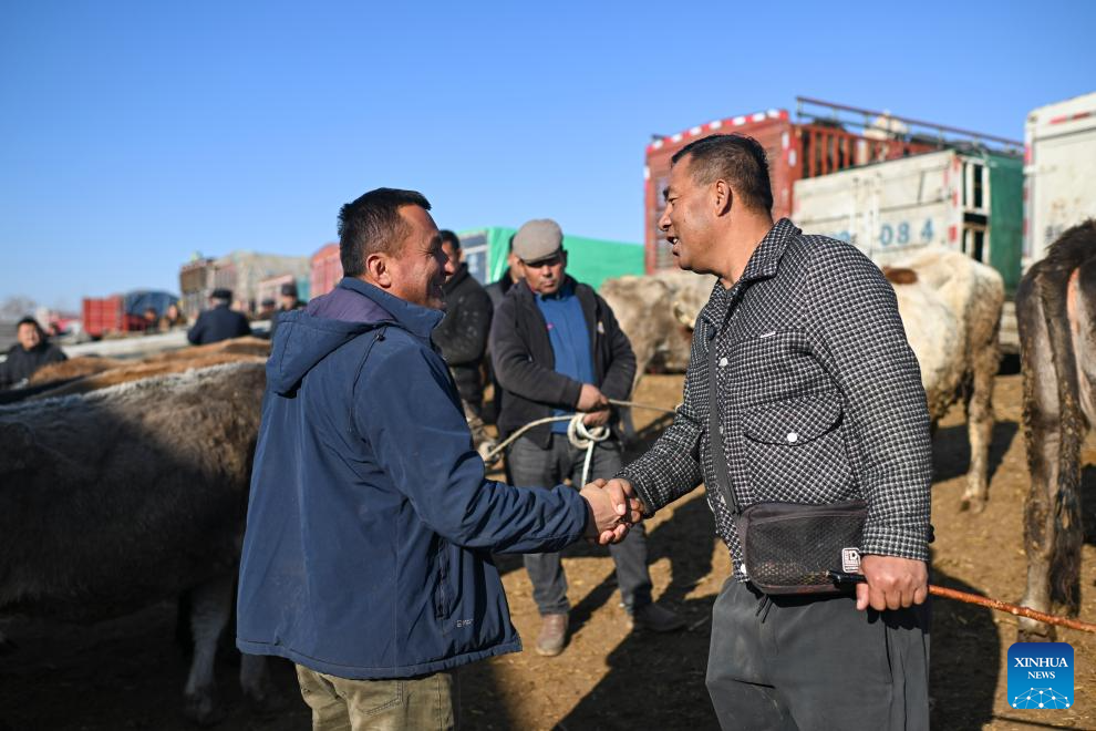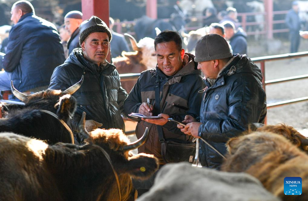 URUMQI, Jan. 18 (Xinhua) -- Huanggong Bazaar in Yining County of northwest China's Xinjiang Uygur Autonomous Region stirs even before dawn on trading days. Shrouded in winter darkness, trucks loaded with cattle, sheep and horses edge toward the gate at this bazaar, arriving in a sequence governed by the market rhythm that has changed little across generations.