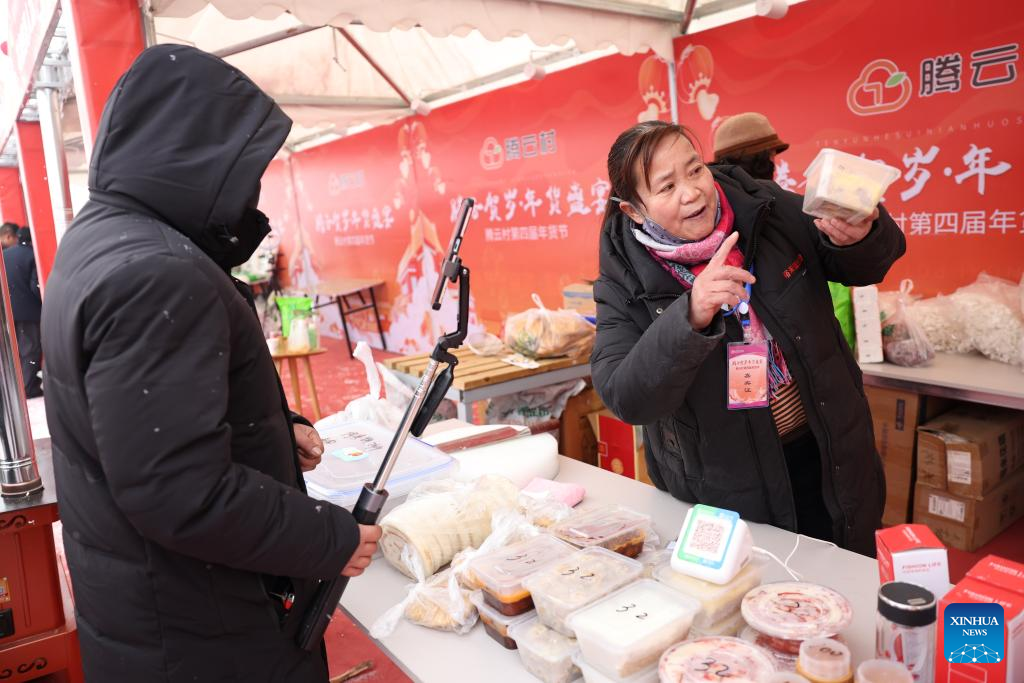 The marketplace drew tens of thousands of visitors on the opening day, with agricultural specialties, local delicacies, children's entertainment, Qinqiang opera performances, and intangible cultural heritage experiences. There were also hundreds of social media influencers broadcasting the bustling market via live-streaming, and collaborating with on-site vendors to promote local high-quality agricultural products, in an effort to activate holiday consumption potential. (Photo by Qi Fuhong/Xinhua)