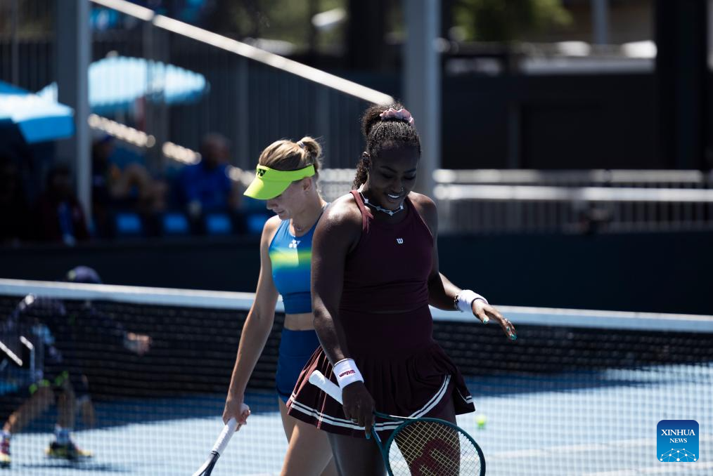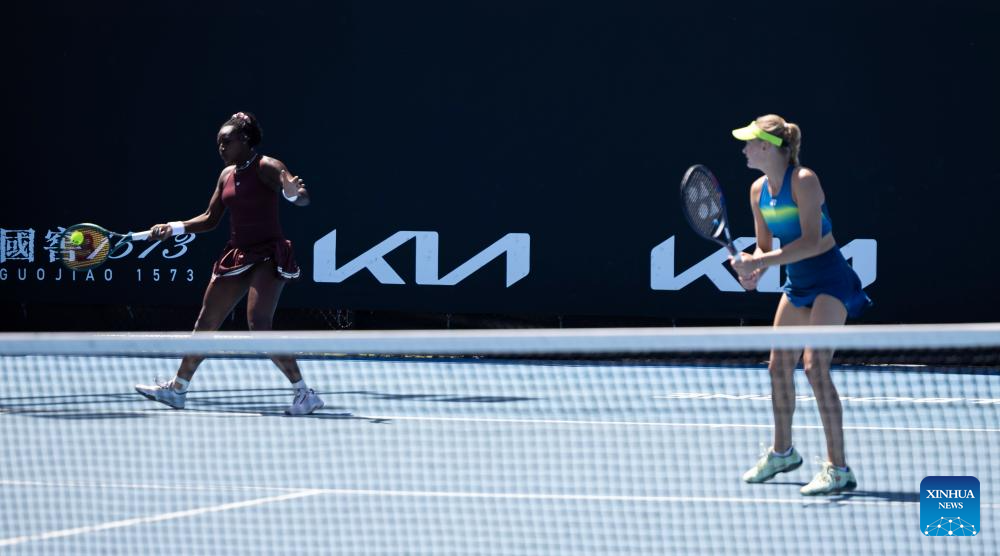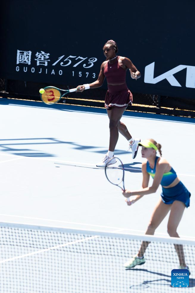 Alycia Parks (L)/Dayana Yastremska compete during the women's doubles 1st round match between Guo Hanyu (China)/Kristina Mladenovic (France) and Alycia Parks (the United States)/Dayana Yastremska (Ukraine) at the Australian Open tennis tournament in Melbourne, Australia, Jan. 22, 2026. (Photo by Hu Jingchen/Xinhua)