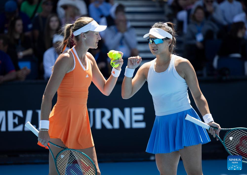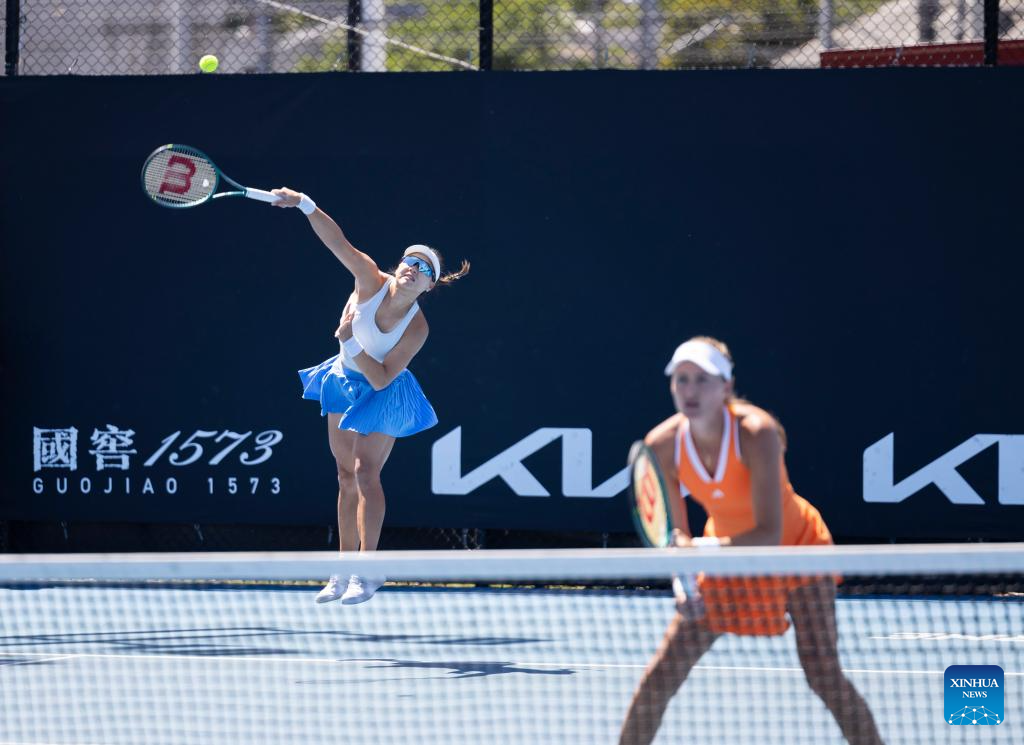 Guo Hanyu (L)/Kristina Mladenovic compete during the women's doubles 1st round match between Guo Hanyu (China)/Kristina Mladenovic (France) and Alycia Parks (the United States)/Dayana Yastremska (Ukraine) at the Australian Open tennis tournament in Melbourne, Australia, Jan. 22, 2026. (Photo by Hu Jingchen/Xinhua)