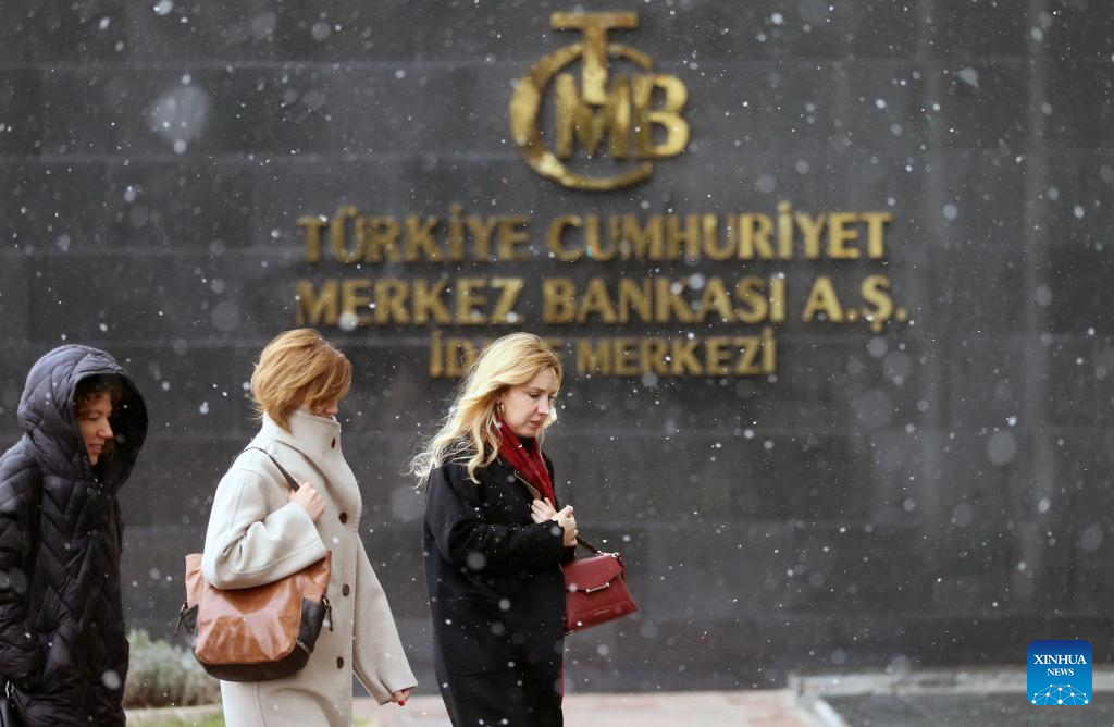 People walk past the Turkish central bank in Ankara, Türkiye, on Jan. 22, 2026. Türkiye's central bank cut its benchmark interest rate by 100 basis points to 37 percent on Thursday, continuing a gradual cycle of easing as inflation shows signs of cooling.