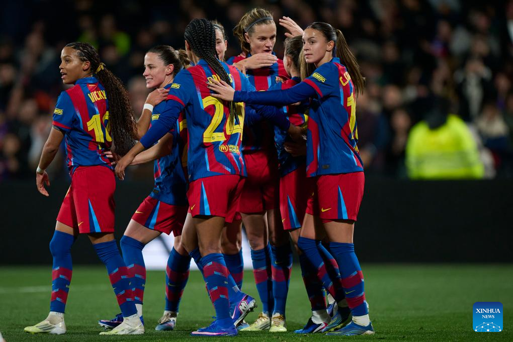 Players of Barcelona celebrate a goal during the Spanish Women Super Cup Match between Barcelona and Athletic Bilbao at Castallia Stadium in Castellon , Spain, Jan. 21, 2026. (Photo by Pablo Morano/Xinhua)