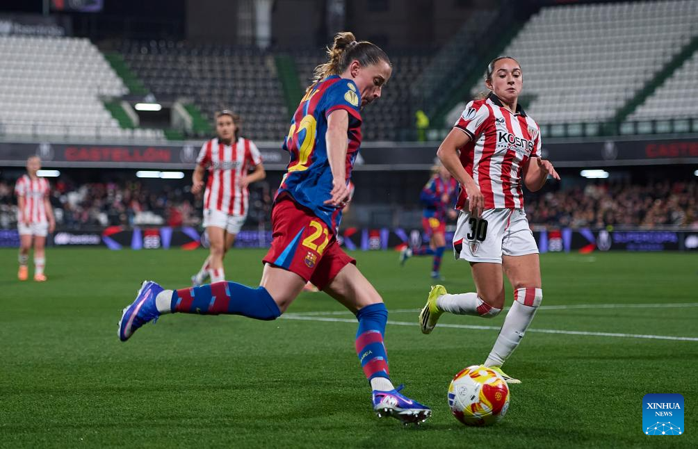 Alexia Putellas (L) of Barcelona vies with Daniela Agote of Athletic Bilbao during the Spanish Women Super Cup Match between Barcelona and Athletic Bilbao at Castallia Stadium in Castellon , Spain, Jan. 21, 2026. (Photo by Pablo Morano/Xinhua)