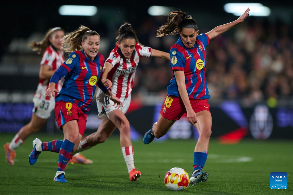 Claudia Pina (L) of Barcelona competes for the ball with Maite Zubieta (C) of Athletic Bilbao during the Spanish Women Super Cup Match between Barcelona and Athletic Bilbao at Castallia Stadium in Castellon , Spain, Jan. 21, 2026. (Photo by Pablo Morano/Xinhua)