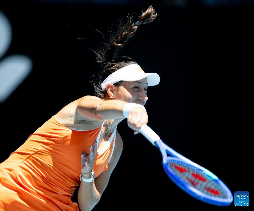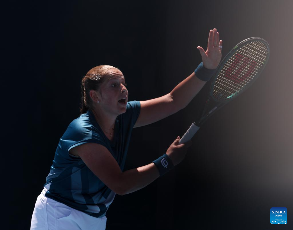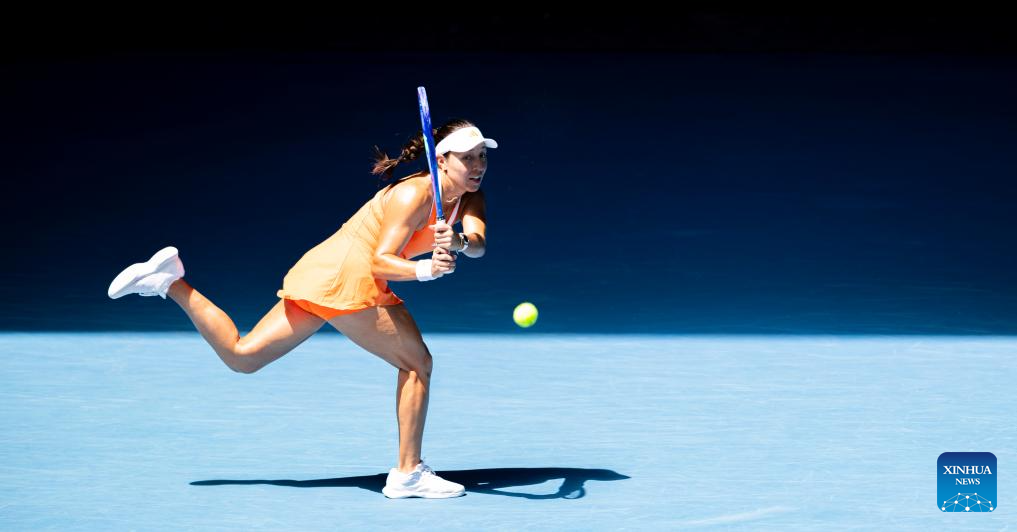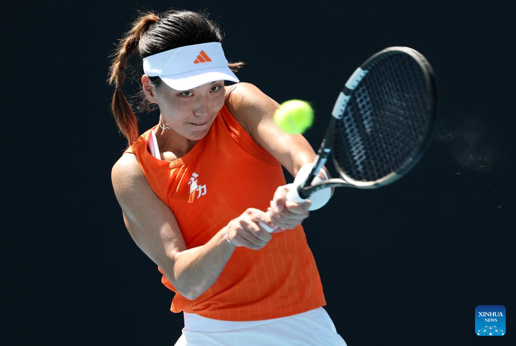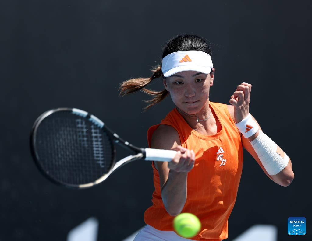 Wang Xinyu of China hits a return during the women's singles 2nd round match against Jelena Ostapenko of Latvia at the Australian Open tennis tournament in Melbourne, Australia, Jan. 22, 2026. (Xinhua/Ma Ping)