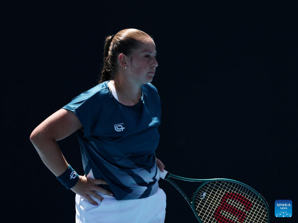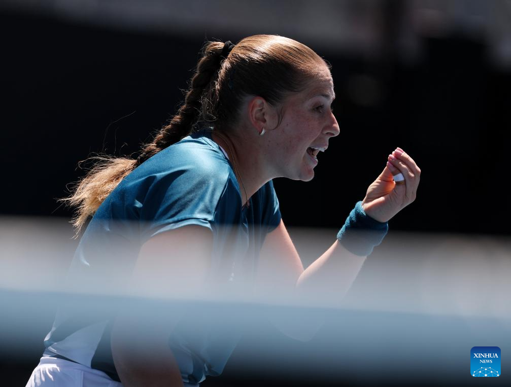 Jelena Ostapenko of Latvia reacts during the women's singles 2nd round match against Wang Xinyu of China at the Australian Open tennis tournament in Melbourne, Australia, Jan. 22, 2026. (Xinhua/Ma Ping)