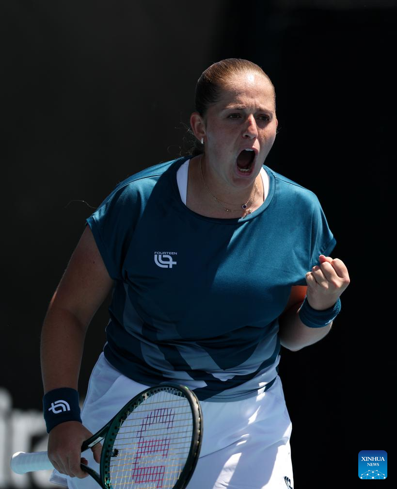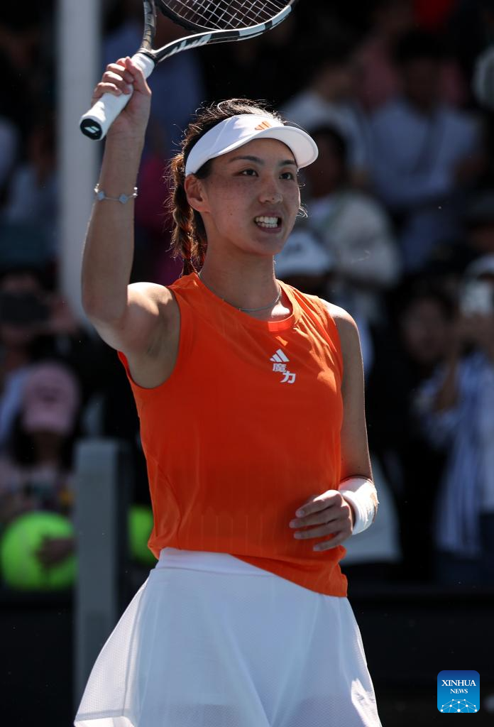 Wang Xinyu of China celebrates after winning the women's singles 2nd round match against Jelena Ostapenko of Latvia at the Australian Open tennis tournament in Melbourne, Australia, Jan. 22, 2026. (Xinhua/Ma Ping)