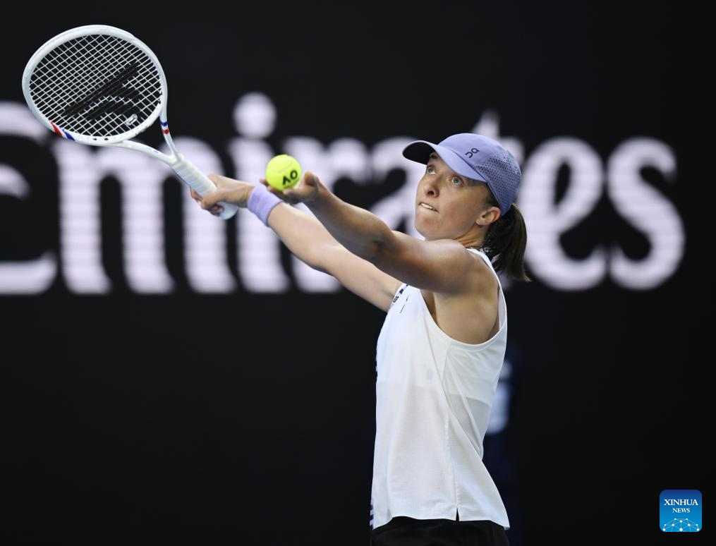 Iga Swiatek of Poland hits a return during the women's singles 2nd round match against Marie Bouzkova of the Czech Republic at the Australian Open tennis tournament in Melbourne, Australia, Jan. 22, 2026. (Photo by Wang Shen/Xinhua)