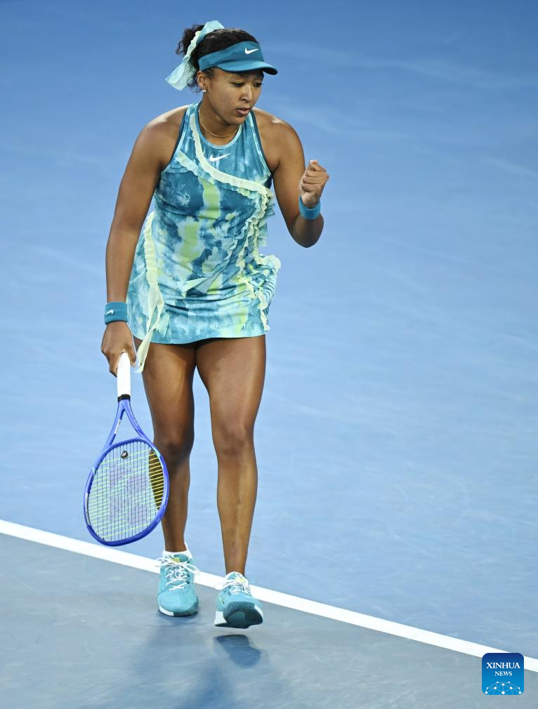 Osaka Naomi celebrates scoring during the women's singles 2nd round match between Osaka Naomi of Japan and Sorana Cirstea of Romania at the Australian Open tennis tournament in Melbourne, Australia, Jan. 22, 2026. (Photo by Wang Shen/Xinhua)