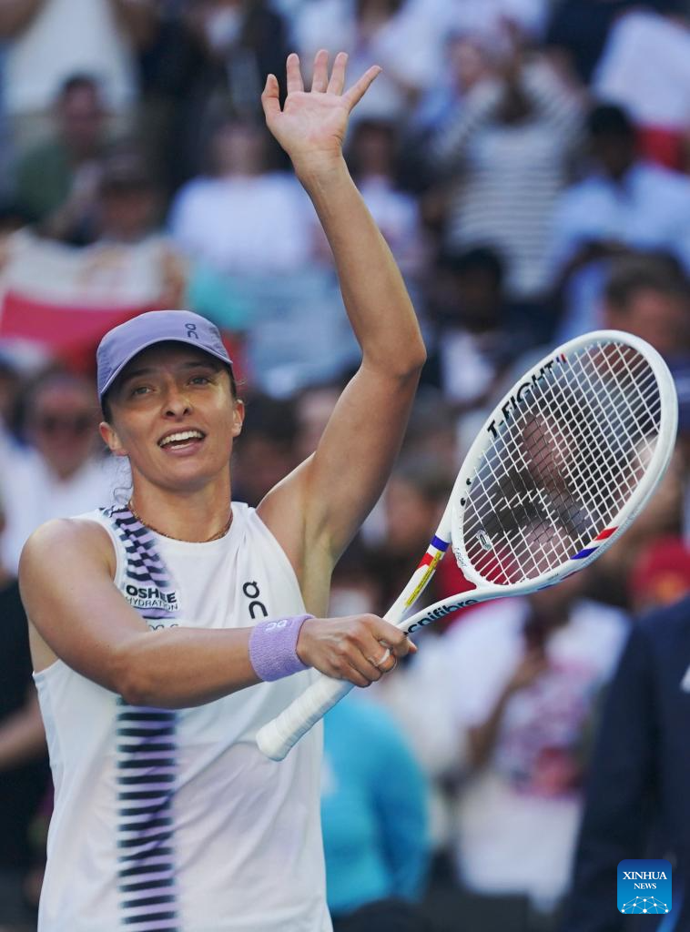 Iga Swiatek of Poland celebrates after winning the women's singles 2nd round match against Marie Bouzkova of the Czech Republic at the Australian Open tennis tournament in Melbourne, Australia, Jan. 22, 2026. (Photo by Wang Shen/Xinhua)