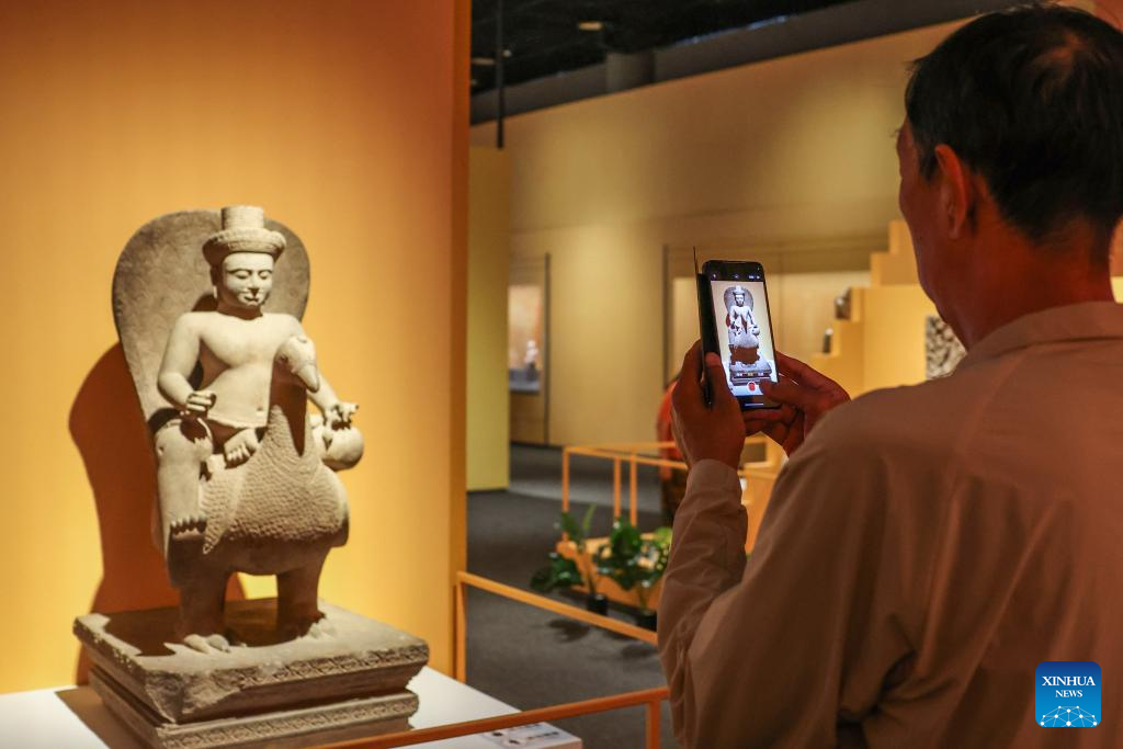 A man takes a photo of an exhibit during "The Epic of Water and Stone," an exhibition of Cambodia's ancient civilization, at China (Hainan) Museum of the South China Sea in Qionghai, south China's Hainan Province, Jan. 22, 2026. Co-hosted by China and Cambodia, the exhibition opened here in recent days, showcasing 122 pieces (sets) of exquisite cultural relics such as stone carvings and pottery from the National Museum of Cambodia. (Xinhua/Zhang Liyun)