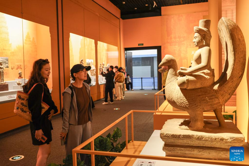 People visit "The Epic of Water and Stone," an exhibition of Cambodia's ancient civilization, at China (Hainan) Museum of the South China Sea in Qionghai, south China's Hainan Province, Jan. 22, 2026. Co-hosted by China and Cambodia, the exhibition opened here in recent days, showcasing 122 pieces (sets) of exquisite cultural relics such as stone carvings and pottery from the National Museum of Cambodia. (Xinhua/Zhang Liyun)