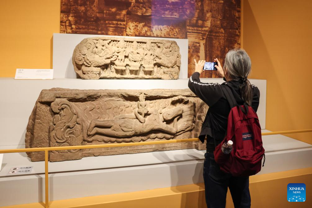 A woman takes a photo of a carved stone lintel exhibited during "The Epic of Water and Stone," an exhibition of Cambodia's ancient civilization, at China (Hainan) Museum of the South China Sea in Qionghai, south China's Hainan Province, Jan. 22, 2026. Co-hosted by China and Cambodia, the exhibition opened here in recent days, showcasing 122 pieces (sets) of exquisite cultural relics such as stone carvings and pottery from the National Museum of Cambodia. (Xinhua/Zhang Liyun)