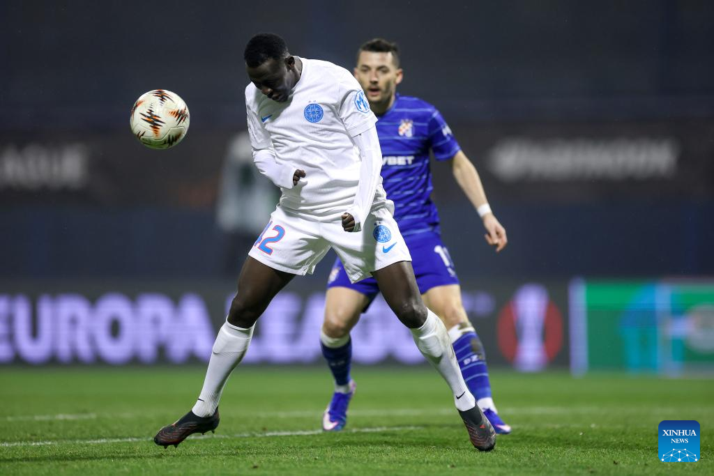 Siyabonga Ngezana (L) of FCSB and Sandro Kulenovic of Dinamo compete for the ball during the UEFA Europa League 2025/26 League Phase match between GNK Dinamo and FCSB in Zagreb, Croatia, Jan. 22, 2026. (Photo by Igor Kralj/PIXSELL via Xinhua)