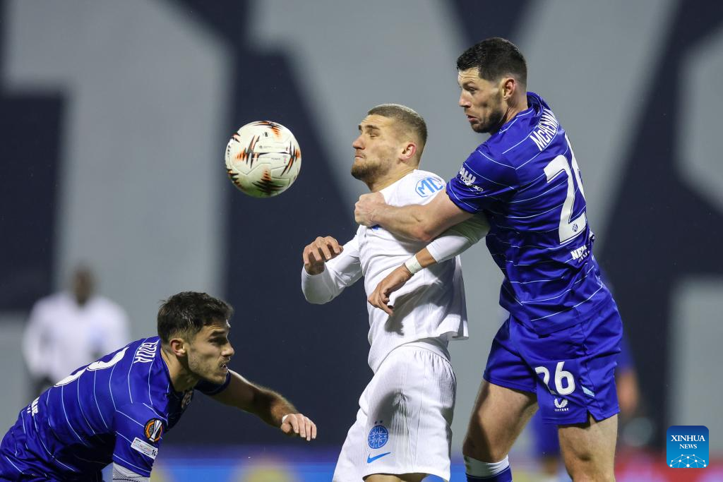Daniel Birligea (C) of FCSB and Scott McKenna (R) of Dinamo compete for the ball during the UEFA Europa League 2025/26 League Phase match between GNK Dinamo and FCSB in Zagreb, Croatia, Jan. 22, 2026. (Photo by Igor Kralj/PIXSELL via Xinhua)