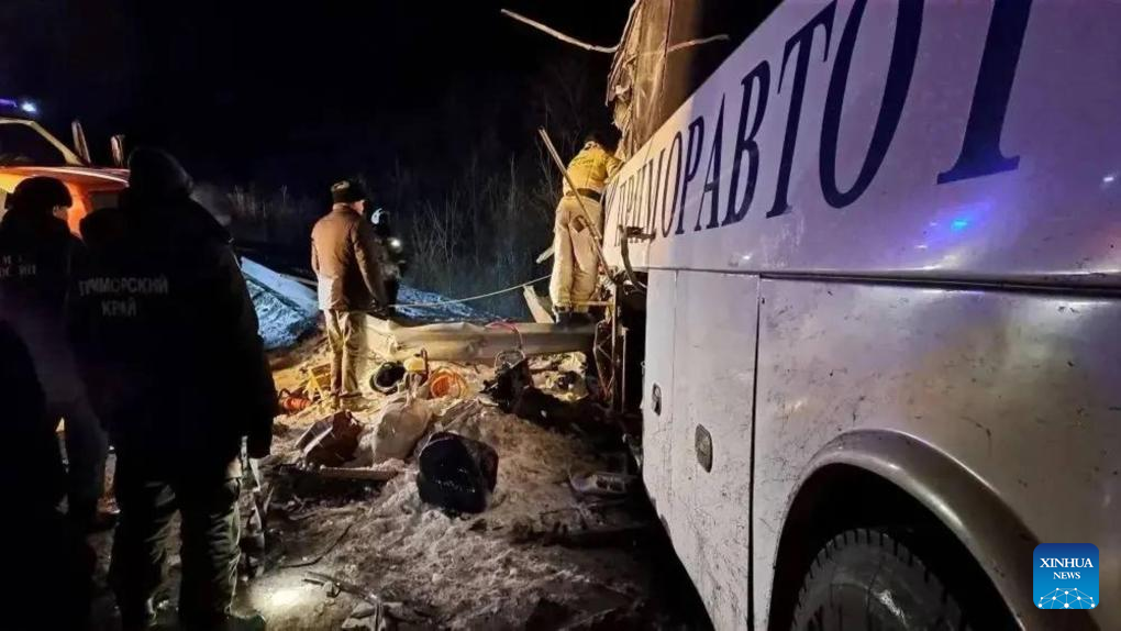 The site of a bus accident is seen in Russia's Primorsky Krai on Jan. 22, 2026. At least three people were killed and eight others injured on Thursday when a bus collided with a truck in Russia's Primorsky Krai, media reported.