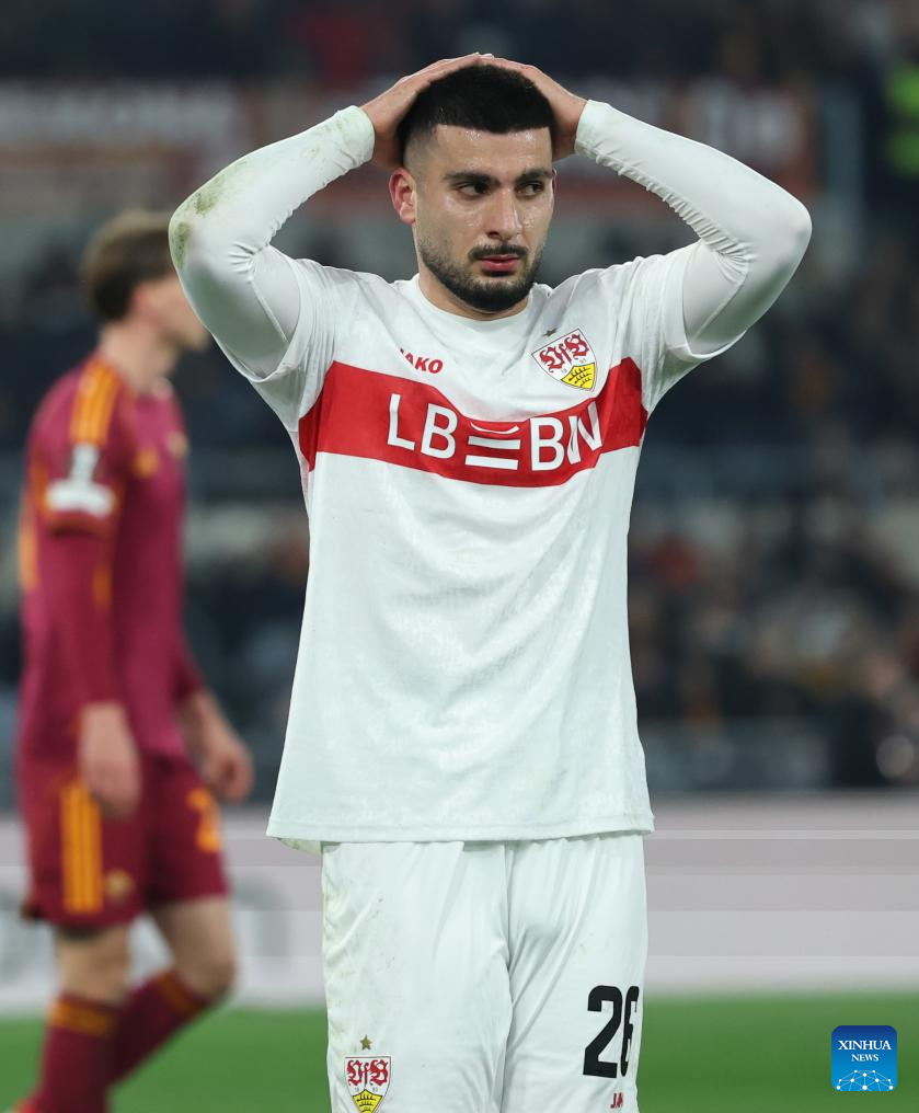 Stuttgart's Deniz Undav reacts during the UEFA Europa League 2025/26 league phase match between Roma and Stuttgart of the UEFA Europa League in Rome, Italy, Jan. 22, 2026. (Xinhua/Li Jing)