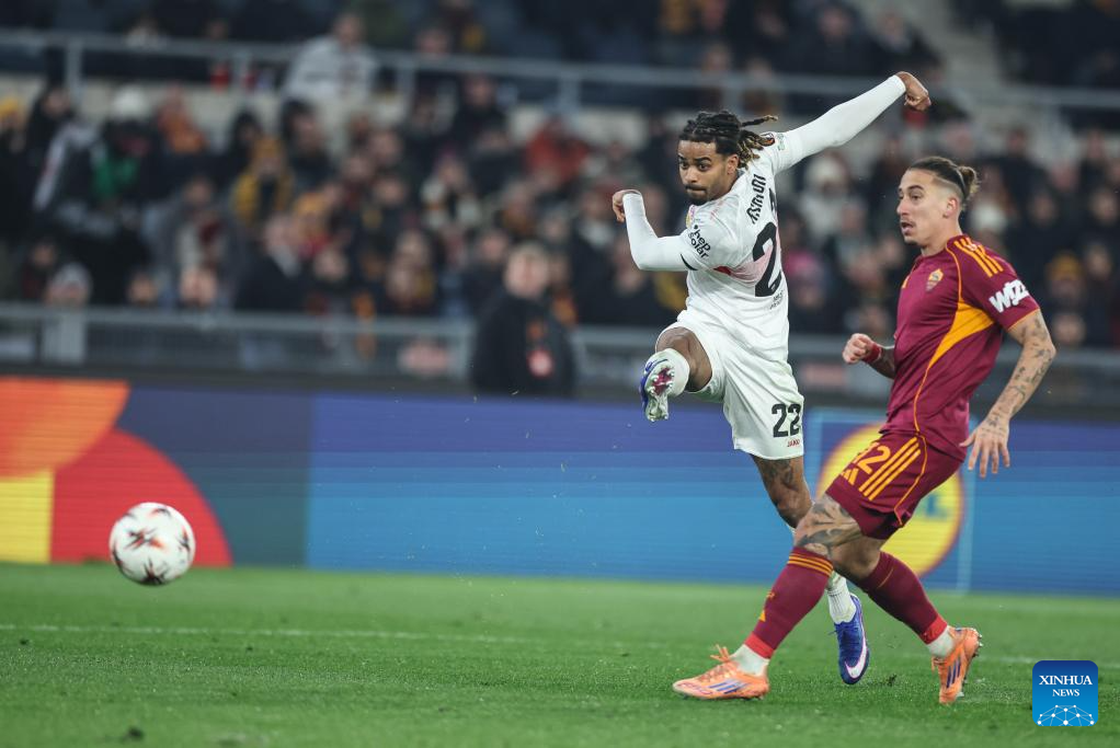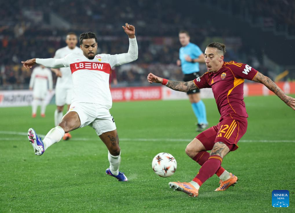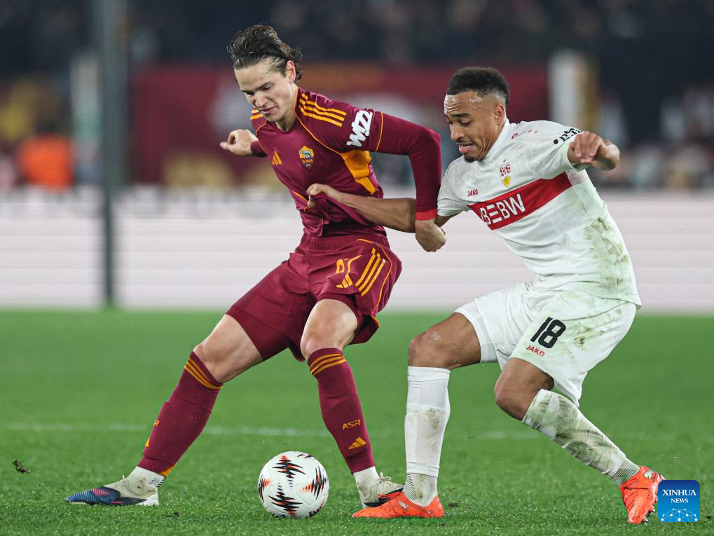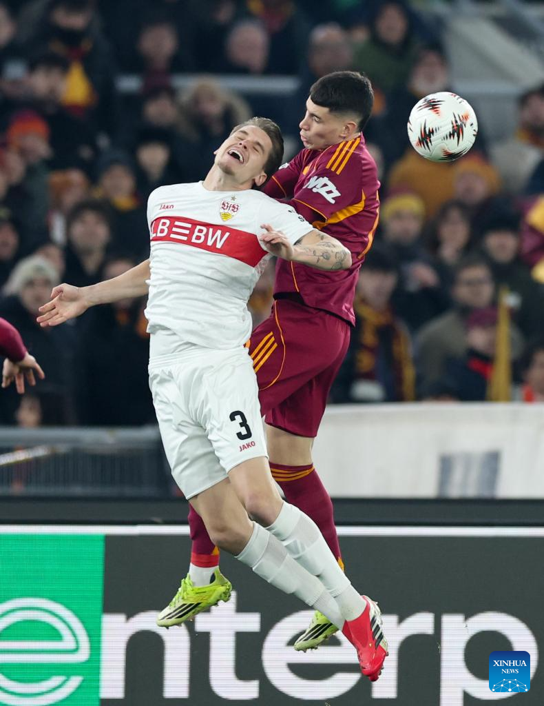 Roma's Daniele Ghilardi (L) vies with Stuttgart's Jamie Leweling during the UEFA Europa League 2025/26 league phase match between Roma and Stuttgart of the UEFA Europa League in Rome, Italy, Jan. 22, 2026. (Xinhua/Li Jing)