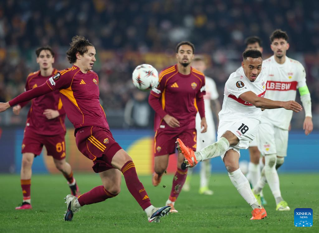 Stuttgart's Lorenz Assignon (L) shoots during the UEFA Europa League 2025/26 league phase match between Roma and Stuttgart of the UEFA Europa League in Rome, Italy, Jan. 22, 2026. (Xinhua/Li Jing)
