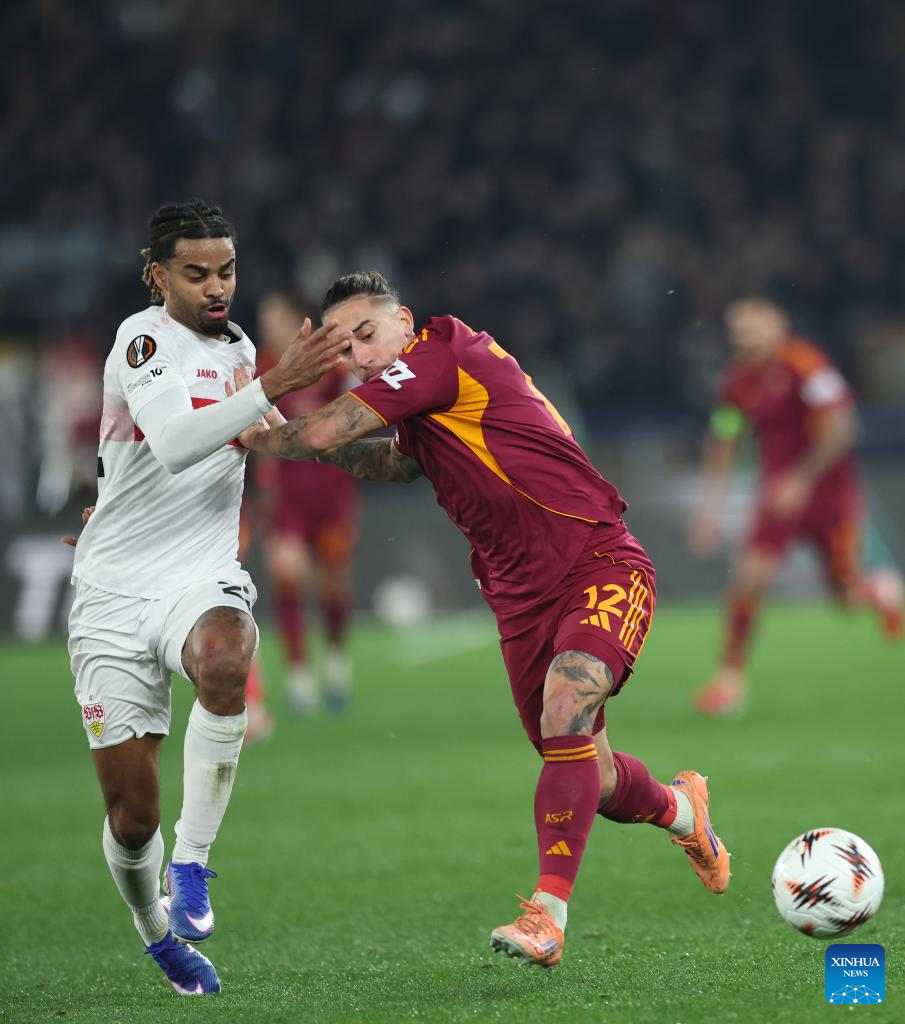 Roma's Matias Soule (R) vies with Stuttgart's Ramon Hendriks during the UEFA Europa League 2025/26 league phase match between Roma and Stuttgart of the UEFA Europa League in Rome, Italy, Jan. 22, 2026. (Xinhua/Li Jing)