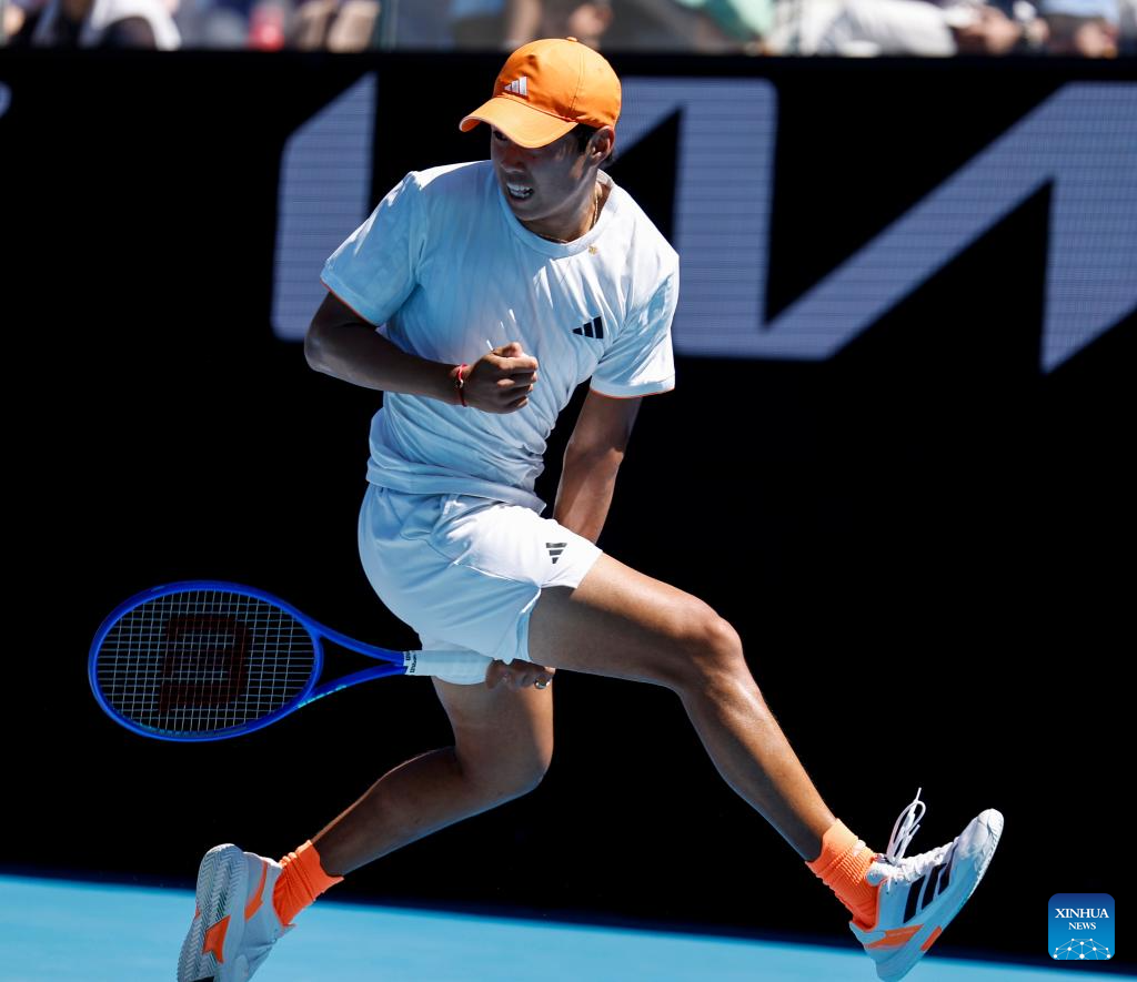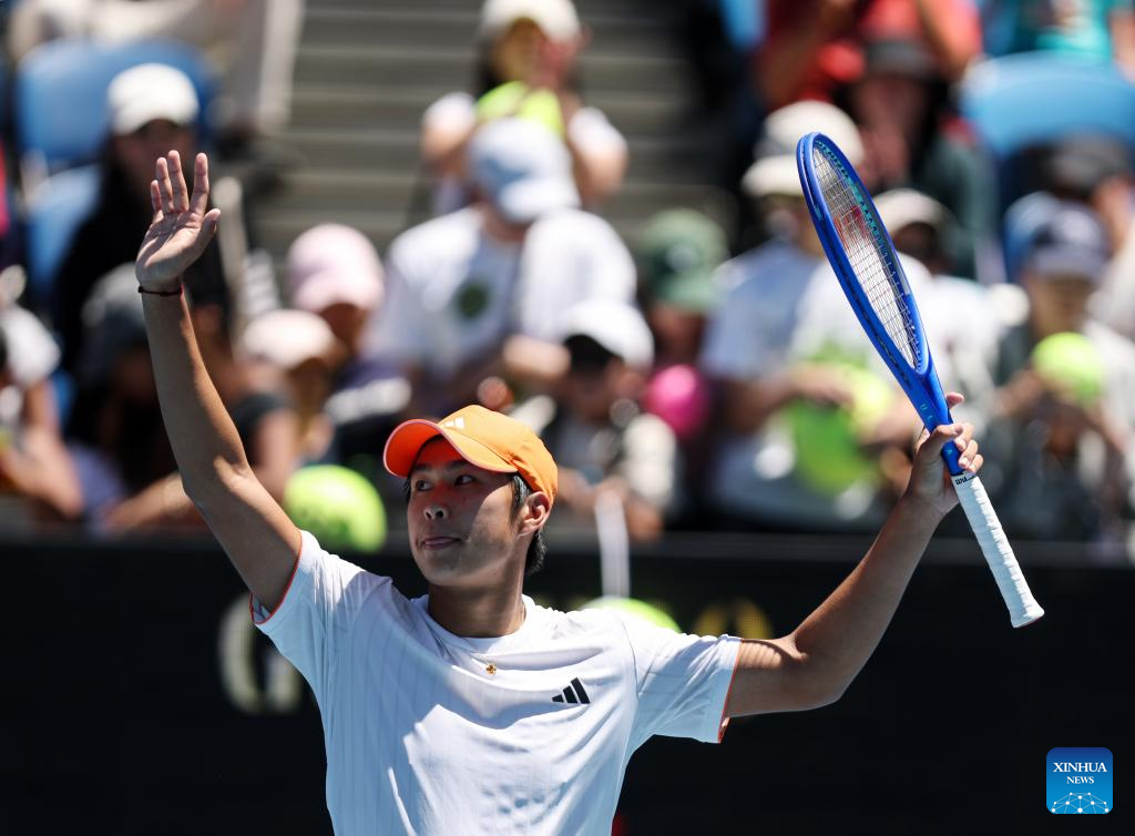 Learner Tien of the United States celebrates after winning the men's singles third round match against Nuno Borges of Portugal at the Australian Open 2026 tennis tournament in Melbourne, Australia, Jan. 23, 2026. (Xinhua/Ma Ping)