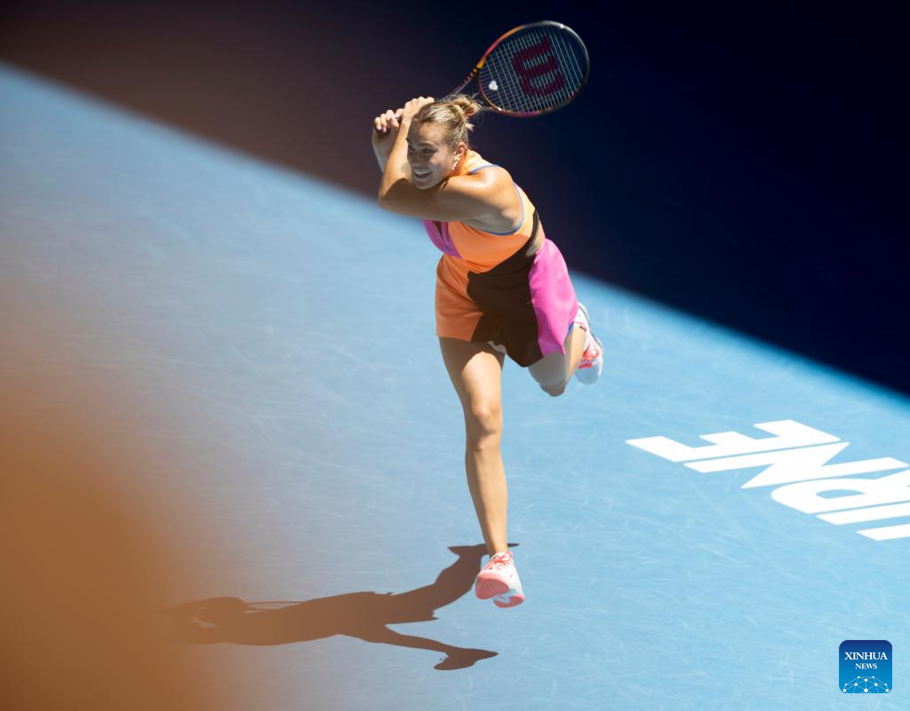 Aryna Sabalenka of Belarus hits a return during the women's singles 3rd round match against Anastasia Potapova of Austria at the Australian Open tennis tournament in Melbourne, Australia, Jan. 23, 2026. (Photo by Hu Jingchen/Xinhua)