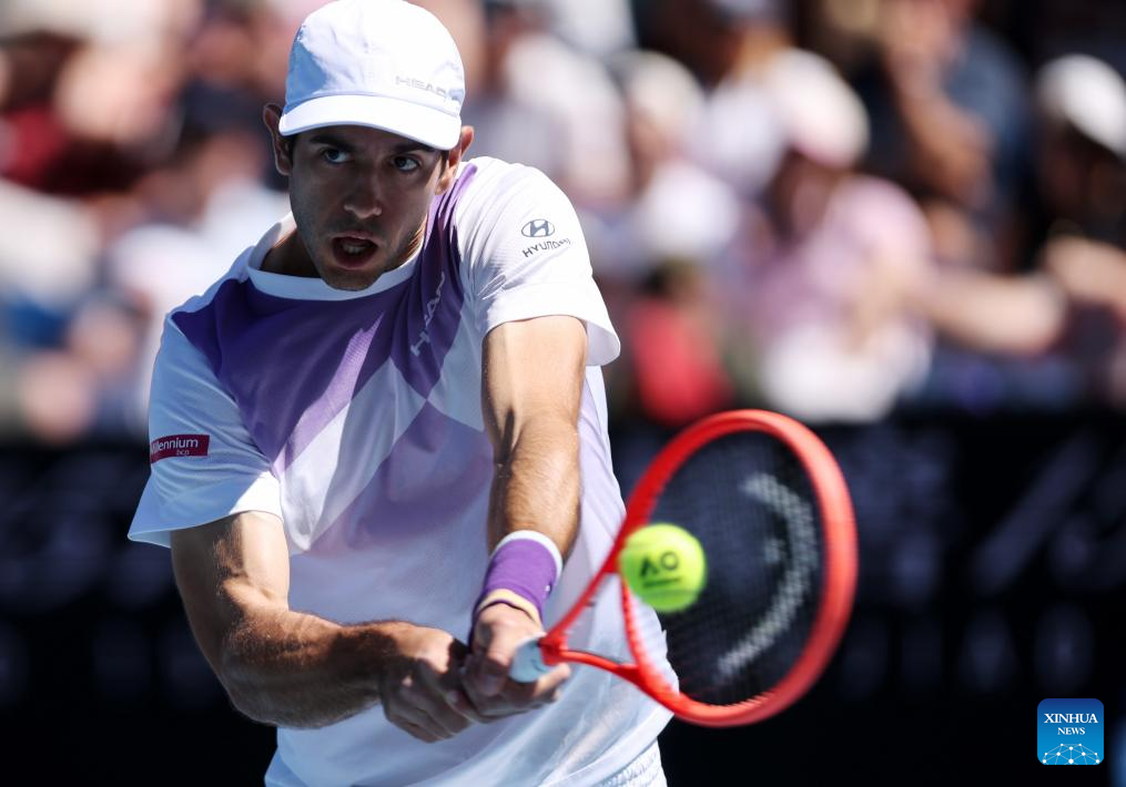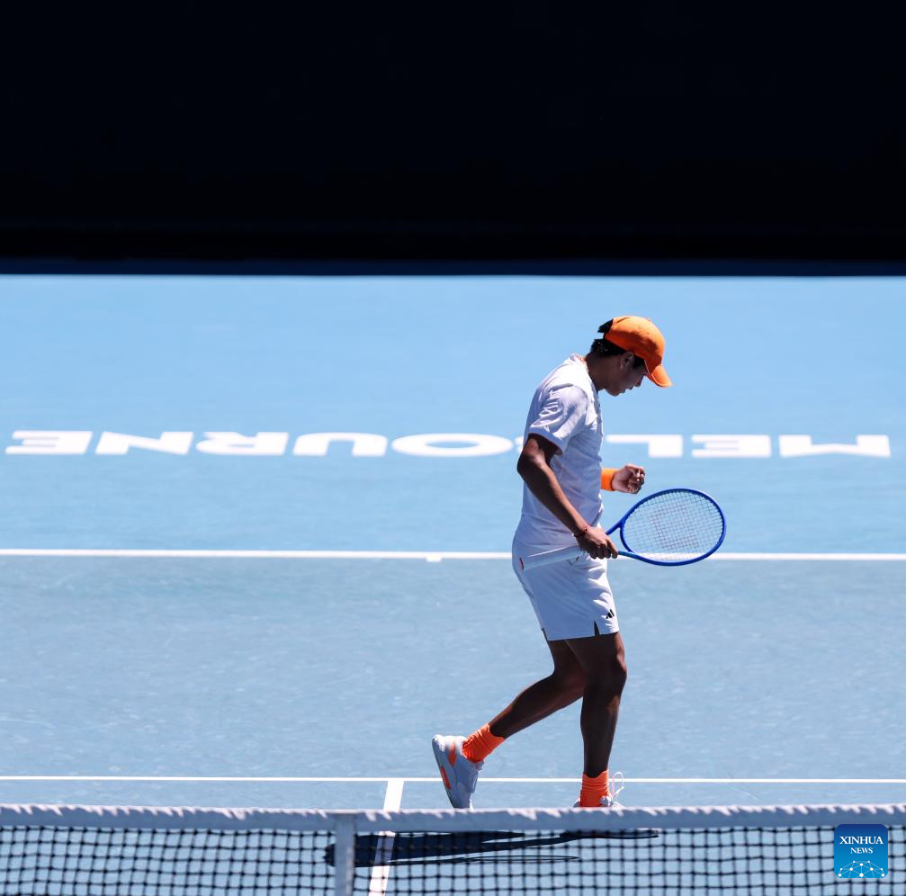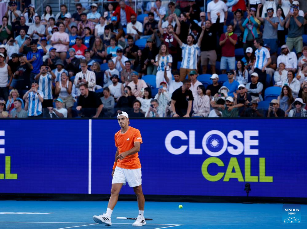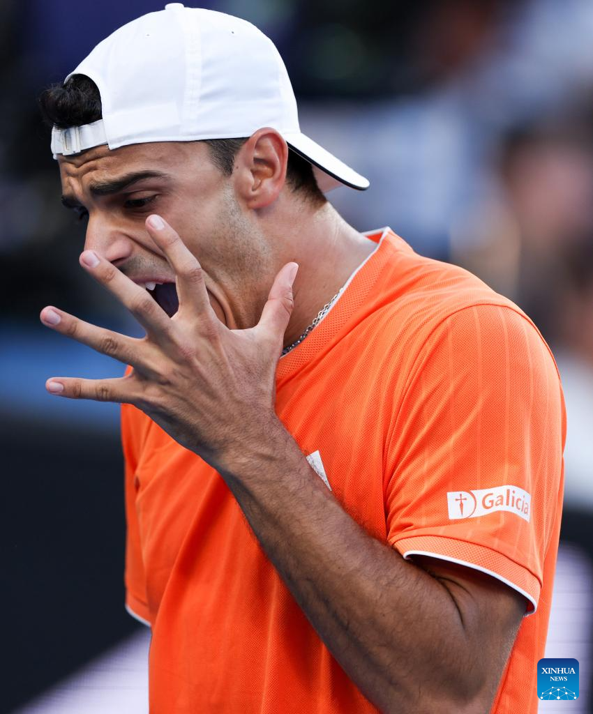 Francisco Cerundolo reacts during the men's singles 3rd round match between Andrey Rublev of Russia and Francisco Cerundolo of Argentina at the Australian Open tennis tournament in Melbourne, Australia, Jan. 23, 2026. (Xinhua/Ma Ping)