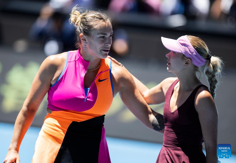 Aryna Sabalenka of Belarus and Anastasia Potapova of Austria reacts during the women's singles 3rd round match between Aryna Sabalenka of Belarus and Anastasia Potapova of Austria at the Australian Open tennis tournament in Melbourne, Australia, Jan. 23, 2026. (Photo by Hu Jingchen/Xinhua)