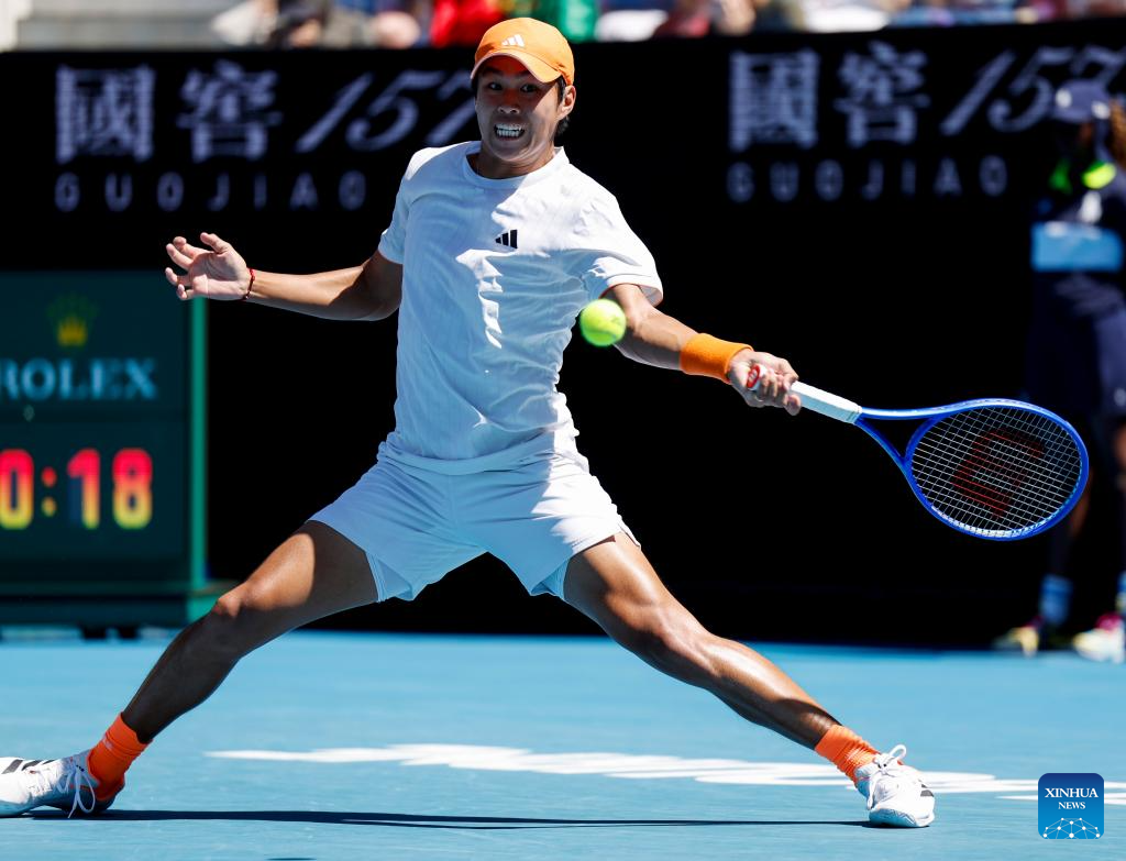Learner Tien of the United States hits a return during the men's singles third round match against Nuno Borges of Portugal at the Australian Open 2026 tennis tournament in Melbourne, Australia, Jan. 23, 2026. (Xinhua/Ma Ping)