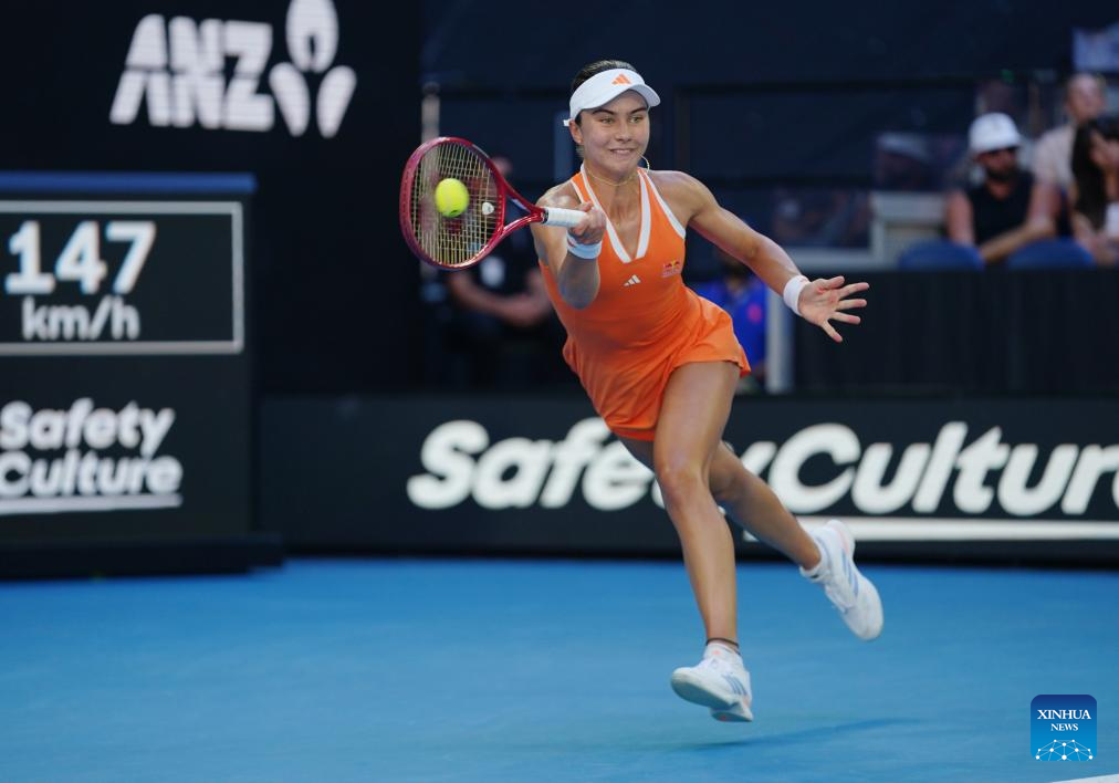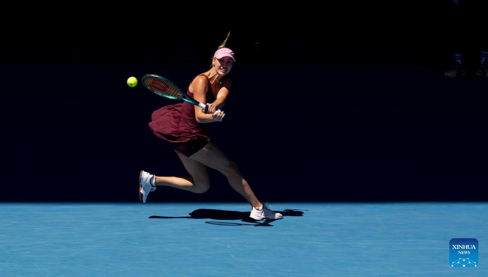 Anastasia Potapova of Austria hits a return during the women's singles 3rd round match against Aryna Sabalenka of Belarus at the Australian Open tennis tournament in Melbourne, Australia, Jan. 23, 2026. (Photo by Hu Jingchen/Xinhua)