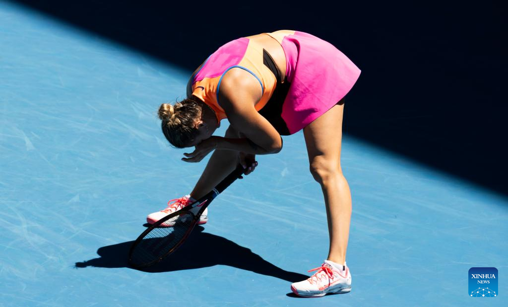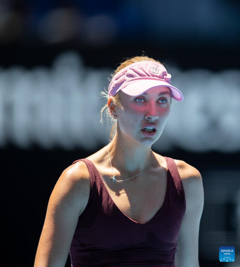 Anastasia Potapova of Austria reacts during the women's singles 3rd round match against Aryna Sabalenka of Belarus at the Australian Open tennis tournament in Melbourne, Australia, Jan. 23, 2026. (Photo by Hu Jingchen/Xinhua)