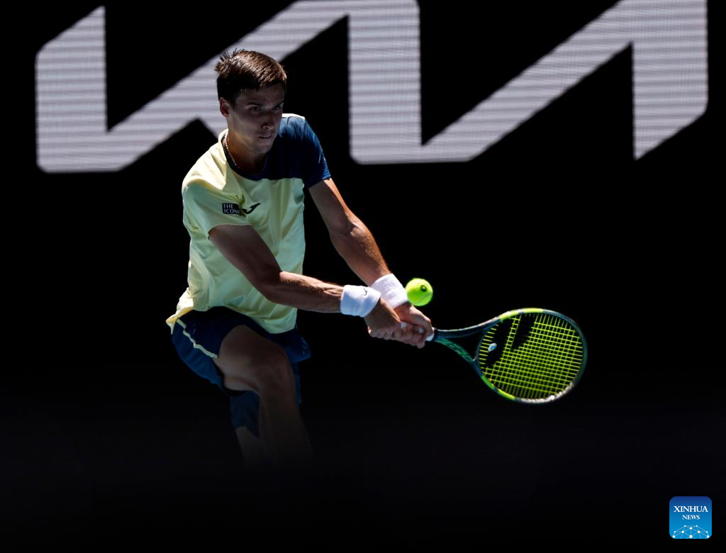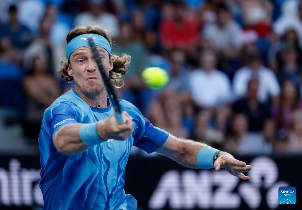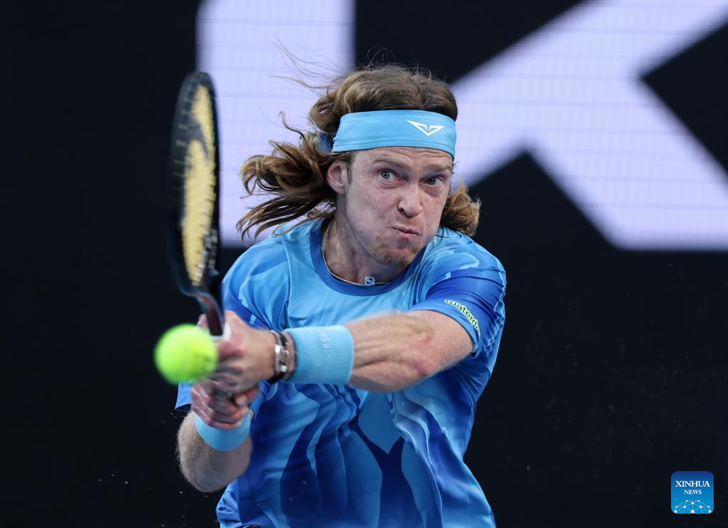 Andrey Rublev hits a return during the men's singles 3rd round match between Andrey Rublev of Russia and Francisco Cerundolo of Argentina at the Australian Open tennis tournament in Melbourne, Australia, Jan. 23, 2026. (Xinhua/Ma Ping)