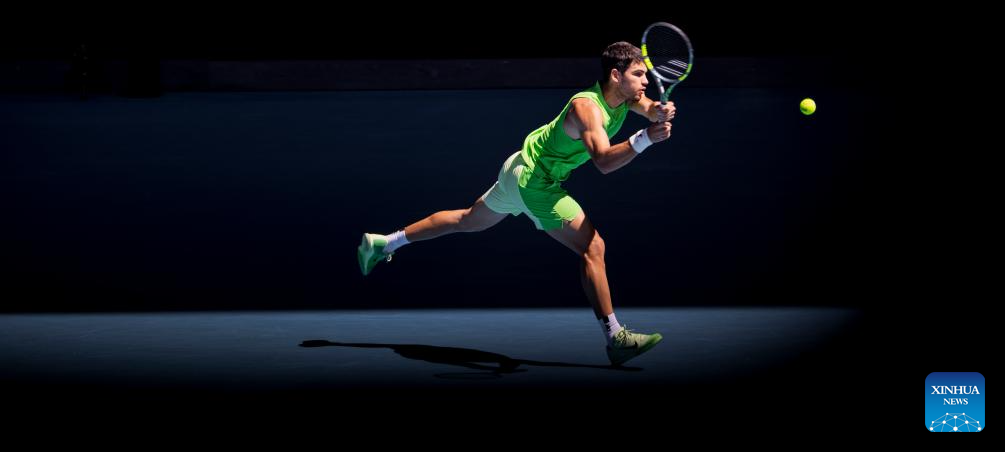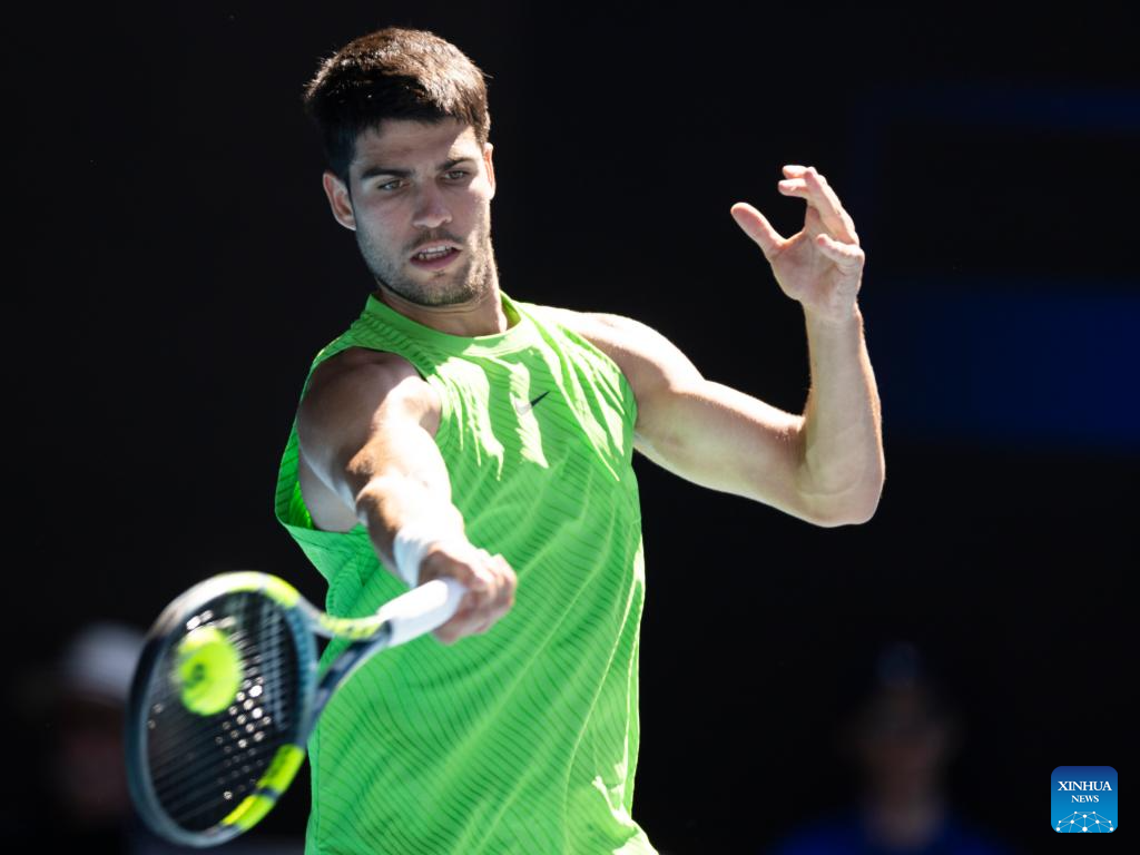 Carlos Alcaraz of Spain hits a return during the men's singles 3rd round match against Corentin Moutet of France at the Australian Open tennis tournament in Melbourne, Australia, Jan. 23, 2026. (Photo by Hu Jingchen/Xinhua)