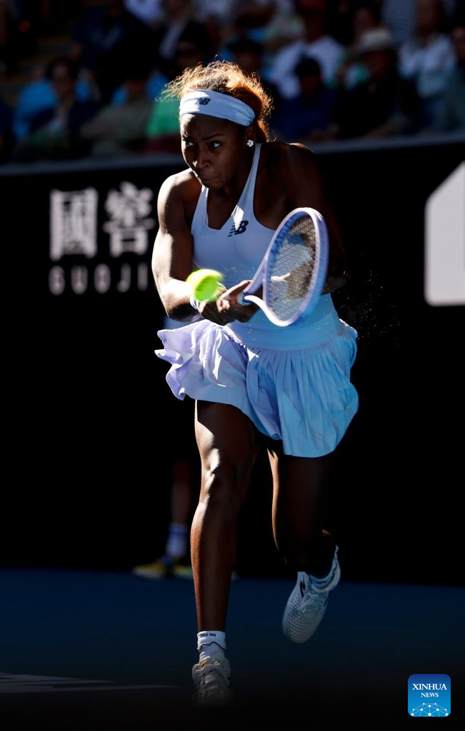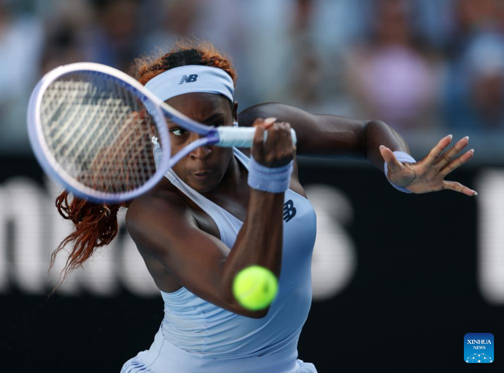 Coco Gauff of the United States hits a return during the women's singles 3rd round match against Hailey Baptiste of the United States at the Australian Open tennis tournament in Melbourne, Australia, Jan. 23, 2026. (Xinhua/Ma Ping)